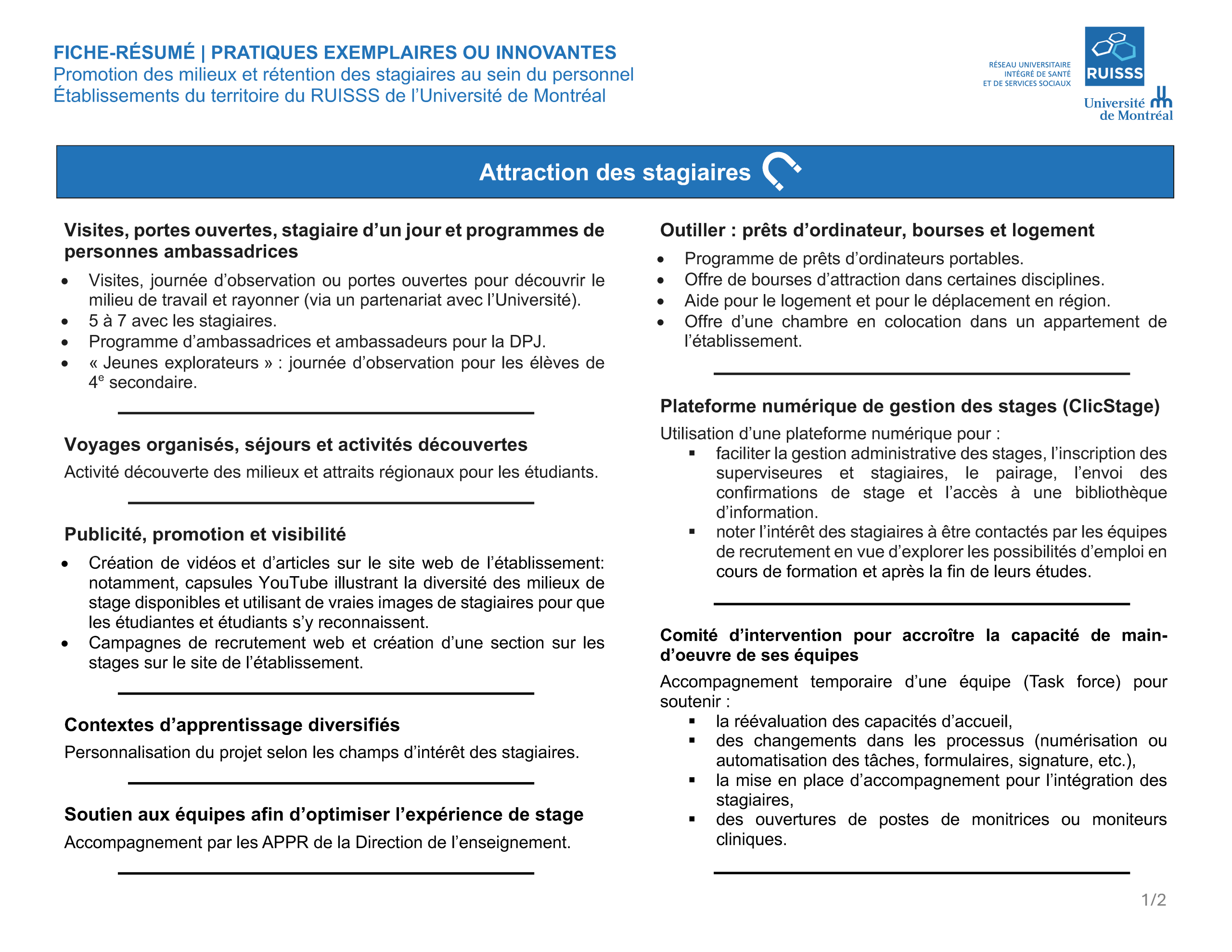Le RUISSS de l’UdeM publie aujourd’hui une fiche-résumé recensant les pratiques mises en place dans le réseau de la santé et des services sociaux pour attirer et fidéliser les stagiaires.