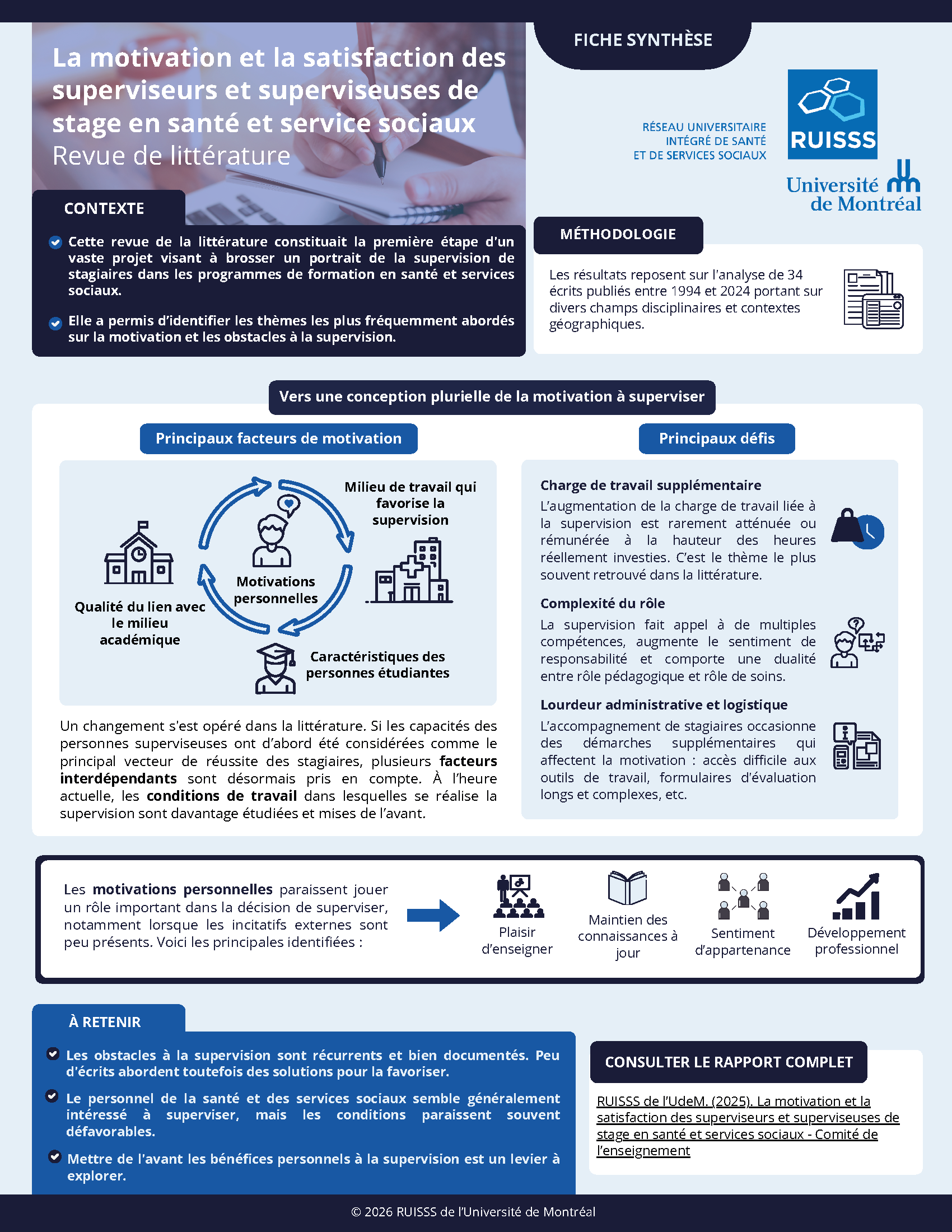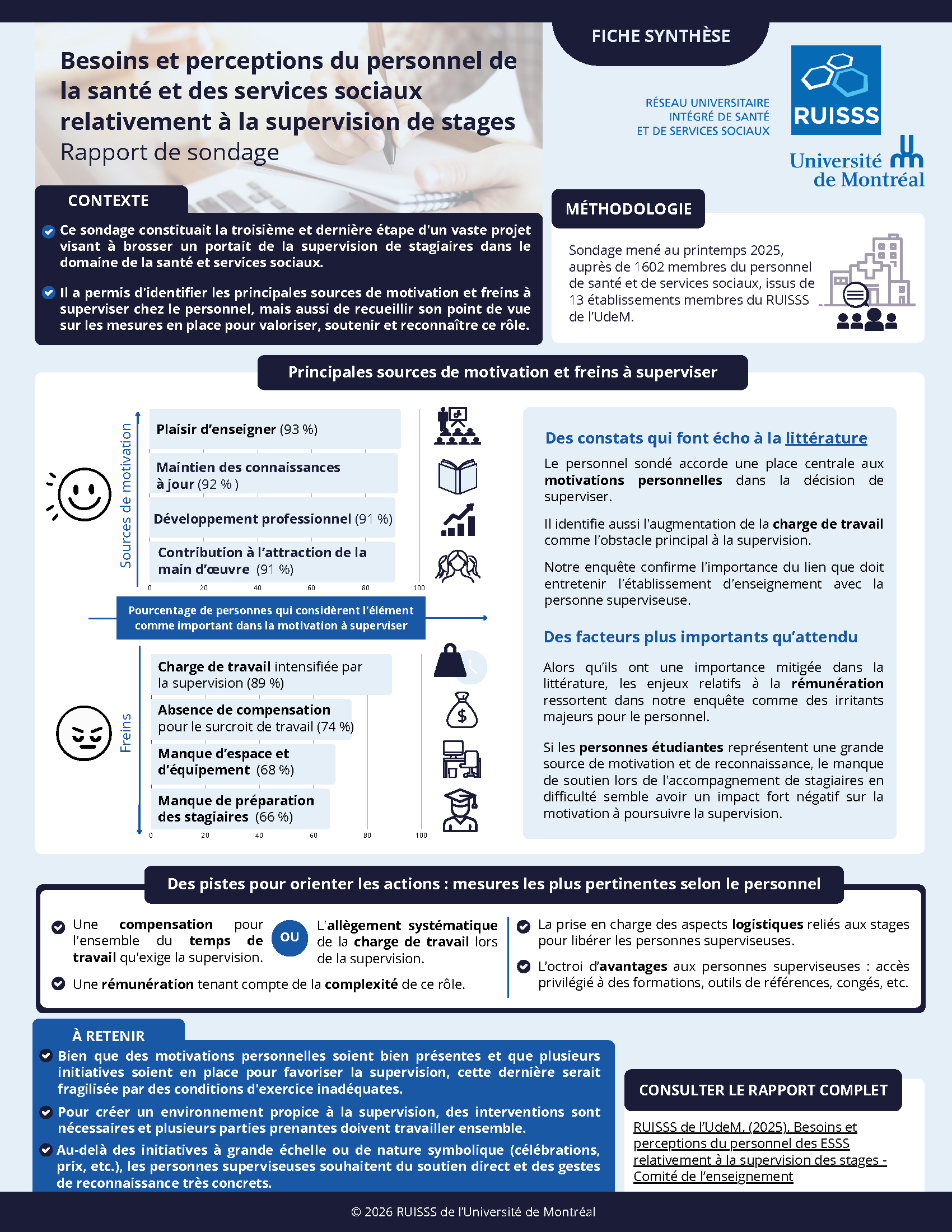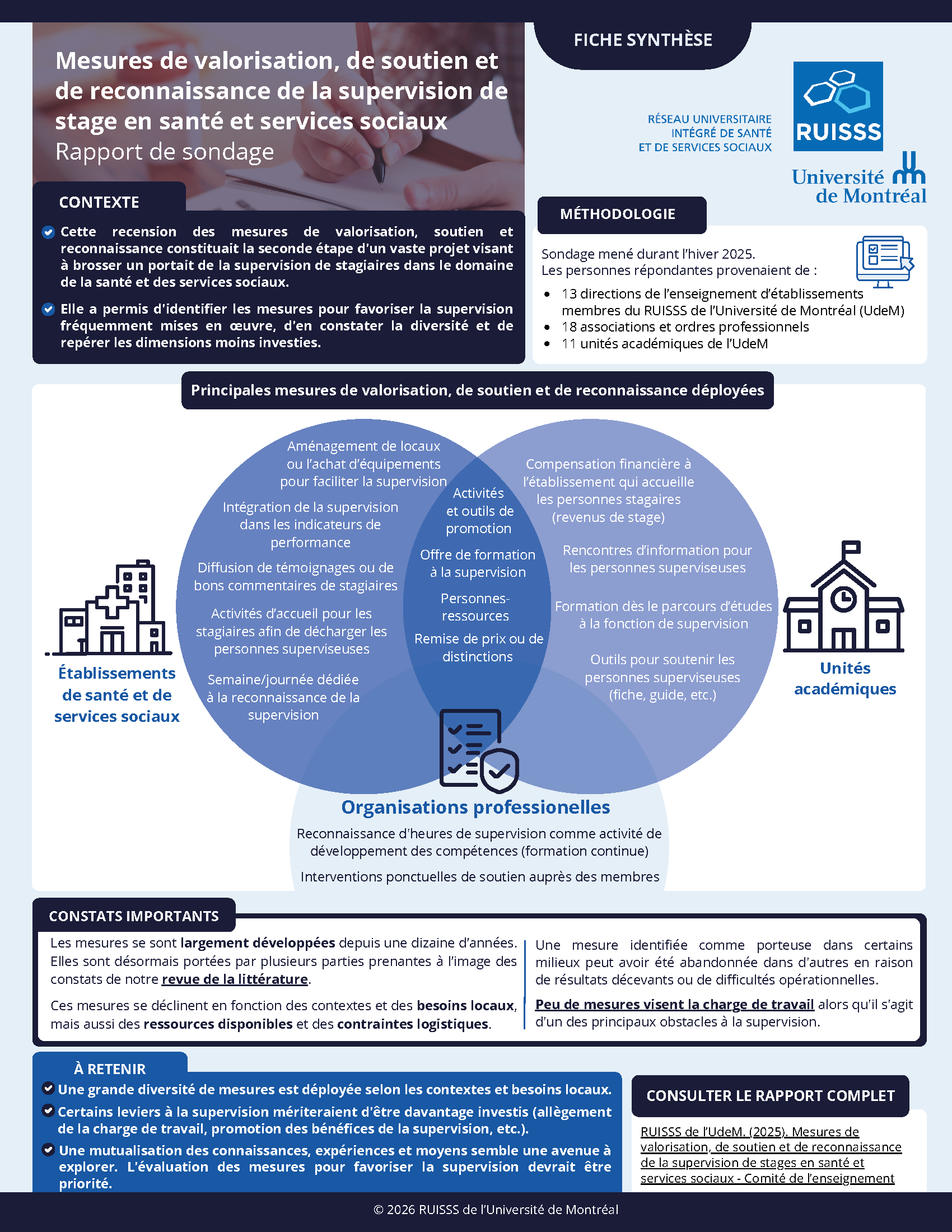 Afin de mieux comprendre les enjeux entourant la supervision de stage et d’orienter les actions, le Comité de l’enseignement du RUISSS de l’UdeM a mis en place le sous-comité valorisation, soutien et reconnaissance de la supervision de stage.